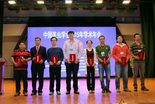 黄大卫副理事长兼秘书长宣读了“中国昆虫学会第七届青年科学技术奖”获奖名单:(1)北方民族大学顾俊杰;(2)浙江大学徐海君;(3)中国计量学院张蓬军;(4)中山大学师超凡;(5)中科院上海生科院植生所詹帅;(6)中国农业大学赵紫华;(7)北京林业大学张东;(8)扬州大学戈林泉。与会嘉宾和学会领导为获奖者颁发了证书,并合影留念。